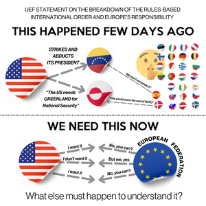 In ihrem Statement vom 6. Januar verurteilt unser Dachverband, die Union Europäischer Föderalisten (UEF), die Aggression der USA gegen Venezuela als schwerwiegenden Verstoß gegen das Völkerrecht und die regelbasierte multilaterale Ordnung. Die UEF fordert von der EU und ihren Mitgliedstaaten die Bildung neuer Allianzen zur Organisation des Widerstands gegen die Machtpolitik der USA und drängt auf die Einleitung einer föderalen politischen Vereinigung, die parallel zum Aufbau einer von den USA unabhängigen europäischen…