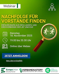 Europa-Union und JEF Deutschland laden am Dienstag, 18. November 2025, um 19.00 Uhr zu einem Webinar zum Thema Vorstandswechsel ein. Manchmal wird die Übergabe von Ämtern zum Hindernislauf: Es scheint immer schwieriger zu werden, Nachfolgerinnen und Nachfolger für Vorstandsämter in Vereinen zu gewinnen, so auch bei der JEF und der Europa-Union. „Zu viel Bürokratie, zu viel Verantwortung und zu viel Zeit“, diese „Vorurteile“ haben bestimmt viele schon einmal gehört. Dass es nicht so laufen muss, wollen wir in dieser Ausgabe der…