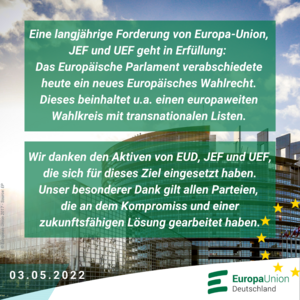 „Wir danken unseren Aktiven, die sich auf allen Ebenen der Europa-Union Deutschland, der JEF und der Union Europäischer Föderalisten für die EU-Wahlrechtsreform eingesetzt haben. Unser Dank gilt insbesondere allen Parteien, die an einem Kompromiss und einer zukunftsfähigen Lösung gearbeitet haben“, betont der EUD-Generalsekretär. Die Europa-Union Deutschland erwarte nun vom Rat der EU, dass dieser den Weg für diese wichtigen Neuerungen frei mache, so Moos.