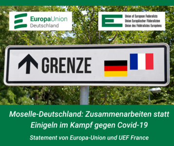 Die UEF Frankreich und die Europa-Union Deutschland fordern, dass die Mitgliedstaaten und die europäischen Institutionen harmonisierte Kriterien für den gesundheitlichen Notfall festlegen, um so die Grundfreiheiten der europäischen Bürgerinnen und Bürger zu schützen und gleichzeitig die Ausbreitung von SARS-Cov2 einzudämmen. Deutschland und Frankreich müssen, wenn das nicht gelingt, ein Beispiel für zwischenstaatliche Zusammenarbeit vorschlagen und dieses Thema auf die europäische Ebene bringen.