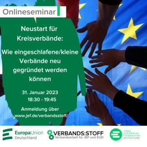 Die letzten drei Jahre waren für Europa-Union und JEF eine schwere Zeit. Die Pandemie brachte das bisher bekannte Vereinsleben zum Stillstand. Digitale Verbandsarbeit wurde vielerorts praktiziert, konnte aber direkte Begegnung nicht ersetzen. In den letzten Jahren wurden deshalb nur wenige Neumitglieder geworben. Ergebnis: Manche Kreisverbände sind eingeschlafen oder drohen wegzubrechen. Jetzt haben JEF und EUD die Chance, Kreisverbände neu zu gründen. Wie das funktionieren kann und was es dazu braucht, darüber tauschen wir uns bei dieser Auflage der JEF-EUD Online Akademie aus.