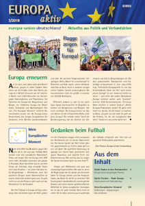 Für die Europa-Union Deutschland ist 365 Tage im Jahr Europa-Tag. Aber jetzt im Mai wird gefeiert: Zur Europawoche 2018 werden wieder Tausende Ehrenamtliche und Europa-Profis unterwegs sein, um auf Straßen und in Sälen für ein vereintes Europa zu werben, Fragen zu beantworten, Zukunftsmodelle für die EU zu diskutieren. Im Einsatz ist dann auch die Sonderausgabe der Mitgliederzeitschrift Europa aktiv. In der aktuellen Ausgabe gibt es ein Special zum Europaangebot auf dem Deutschen Katholikentag, die neue Rubrik "Mein Europäischer…